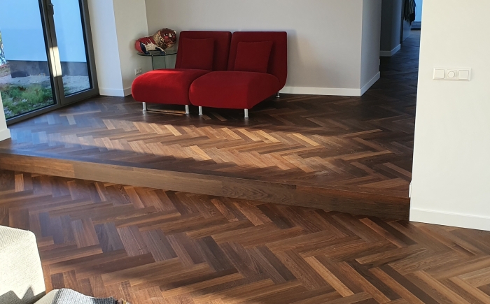 Dankzij het iconische visgraatpatroon ontstaat een optisch spel van diepte en verfijning. Of je nu gaat voor klassiek met band en bies, of juist voor een strakke, moderne afwerking — visgraatvloeren blijven een tijdloze keuze voor wie houdt van stijl én kwaliteit.